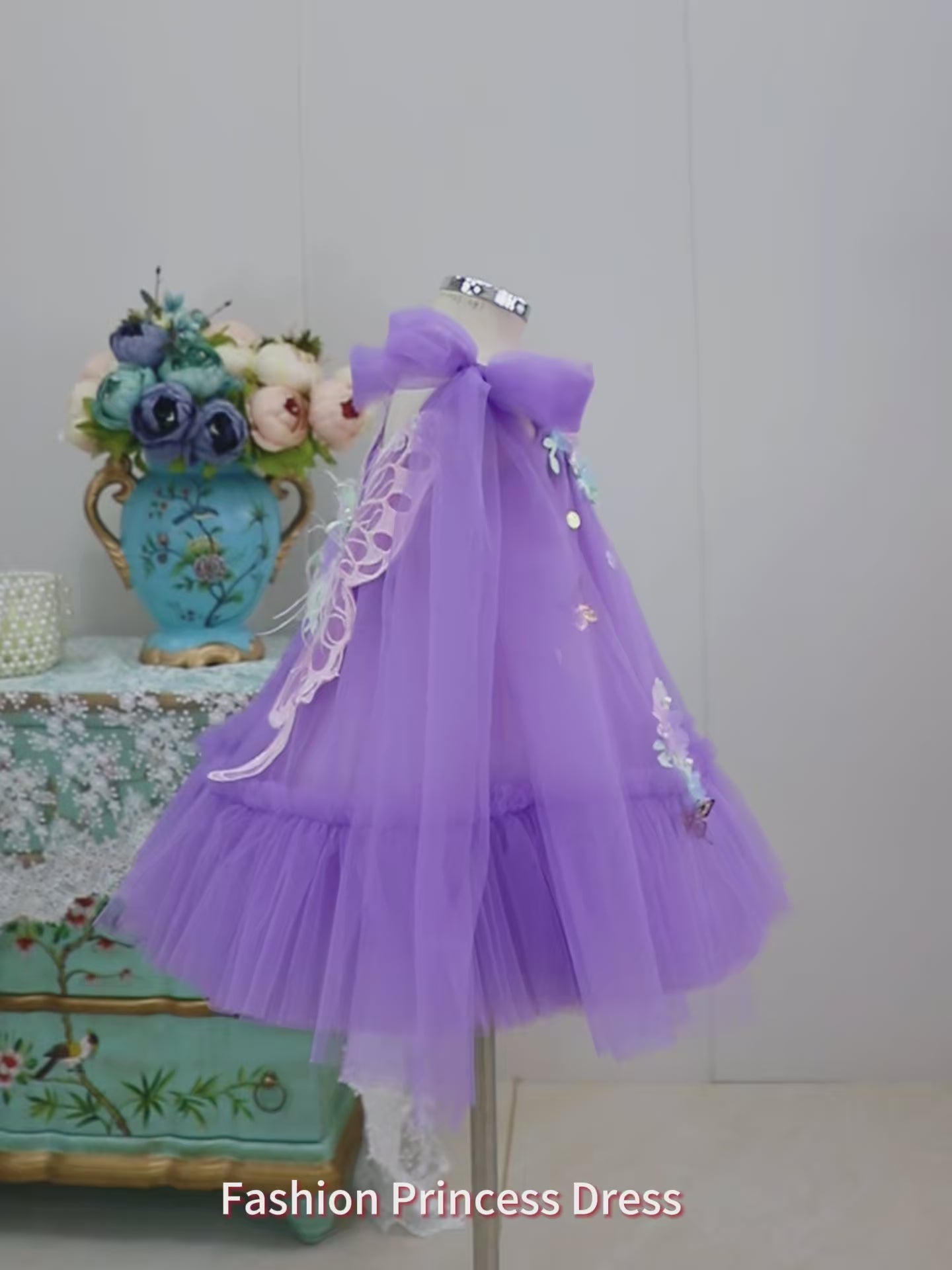 Designed for enchanting moments, this pink tulle dress features a voluminous layered skirt adorned with intricate floral appliqués and shimmering butterfly decorations. The round neckline and short sleeves are delicately edged with lace trim, enhancing its fairy tale charm. Ideal for weddings, birthdays, or formal celebrations, it ensures comfort with breathable tulle and a flattering princess silhouette.