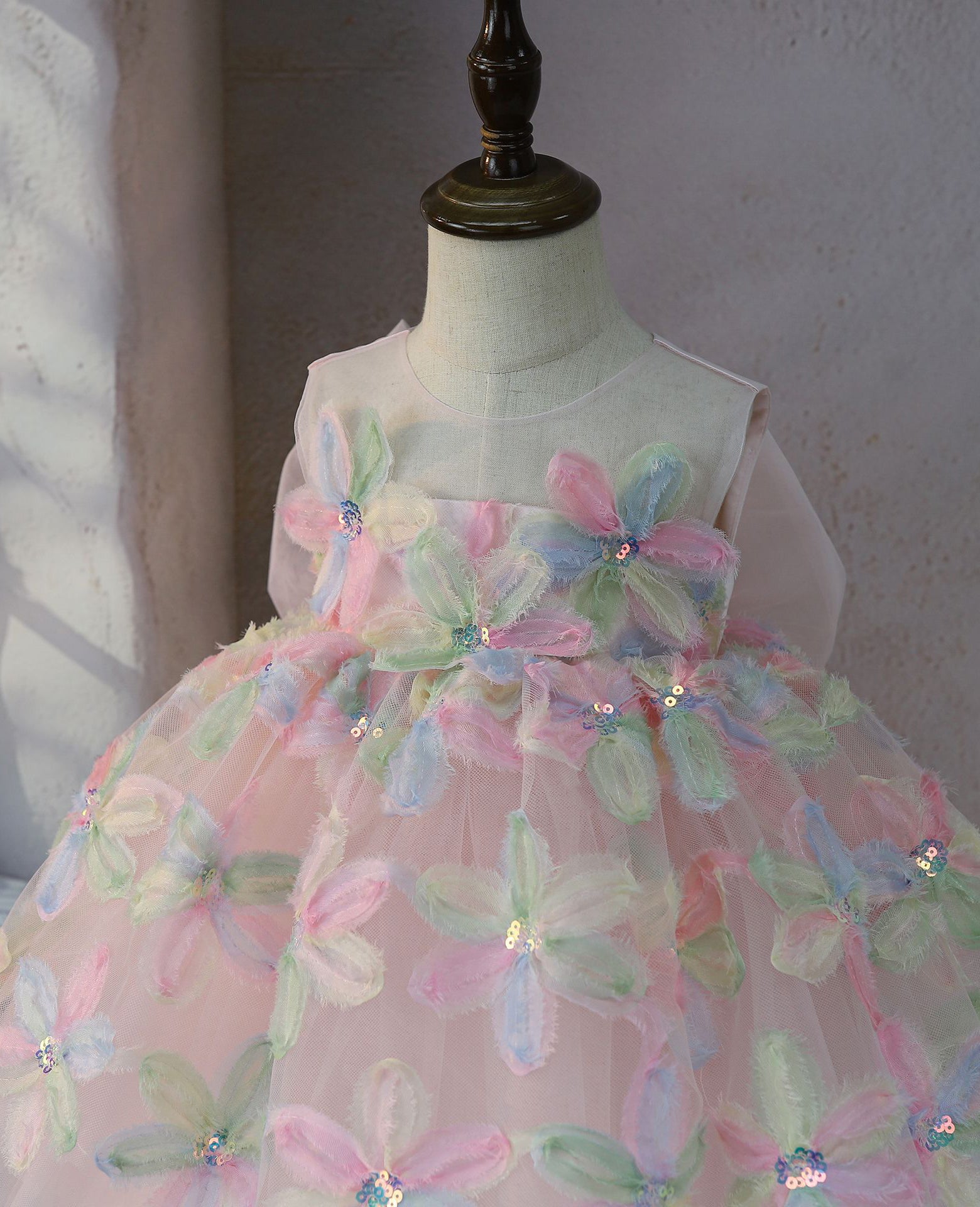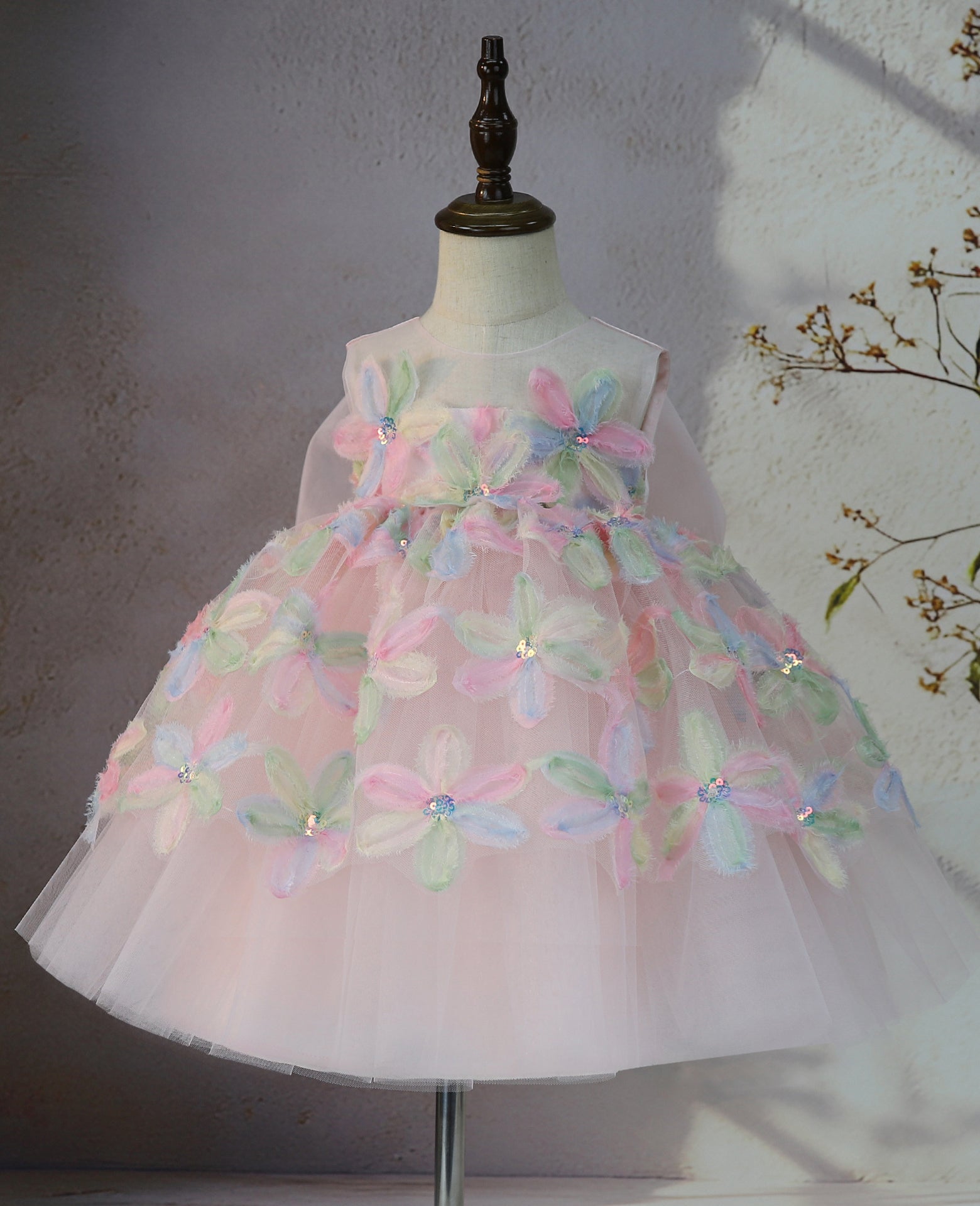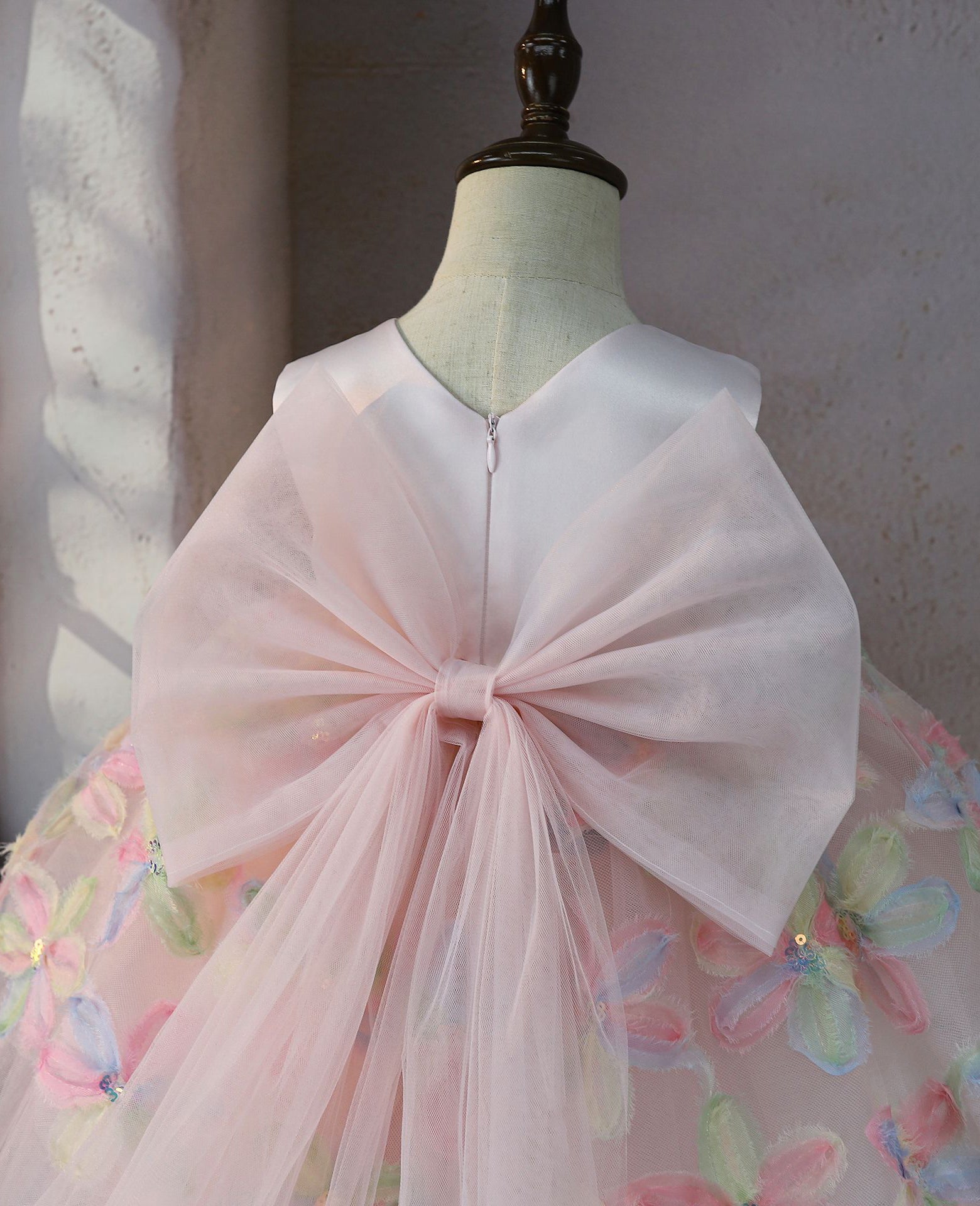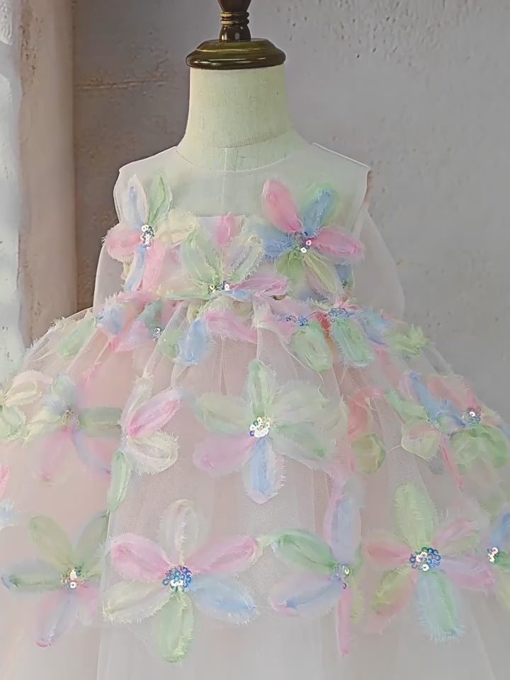 This stunning pink dress flower delicate lace sleeves, a pearl collar, and a full skirt adorned with intricate floral details. A sheer bow adds an elegant touch to this timeless piece, perfect for your little girl's special day.