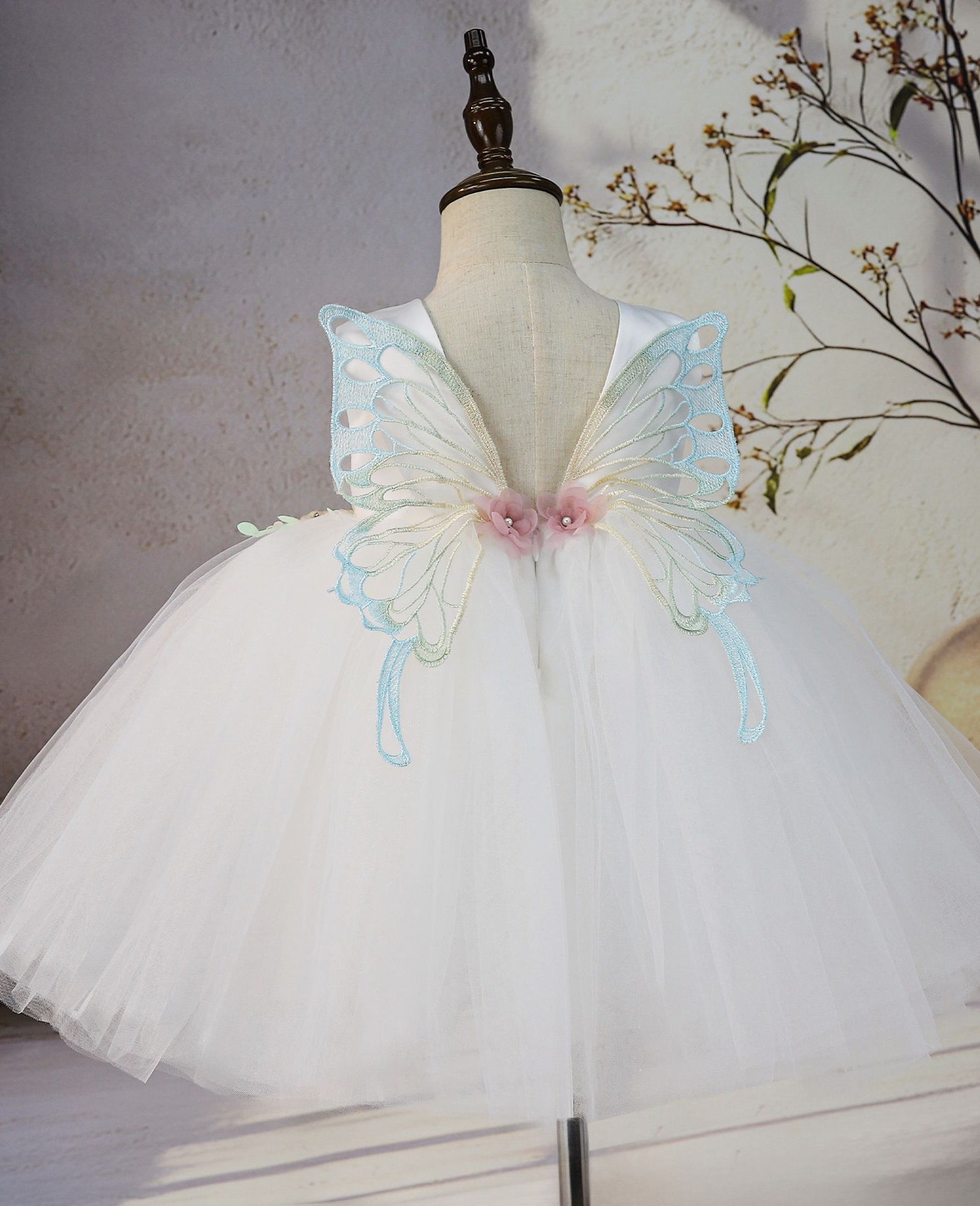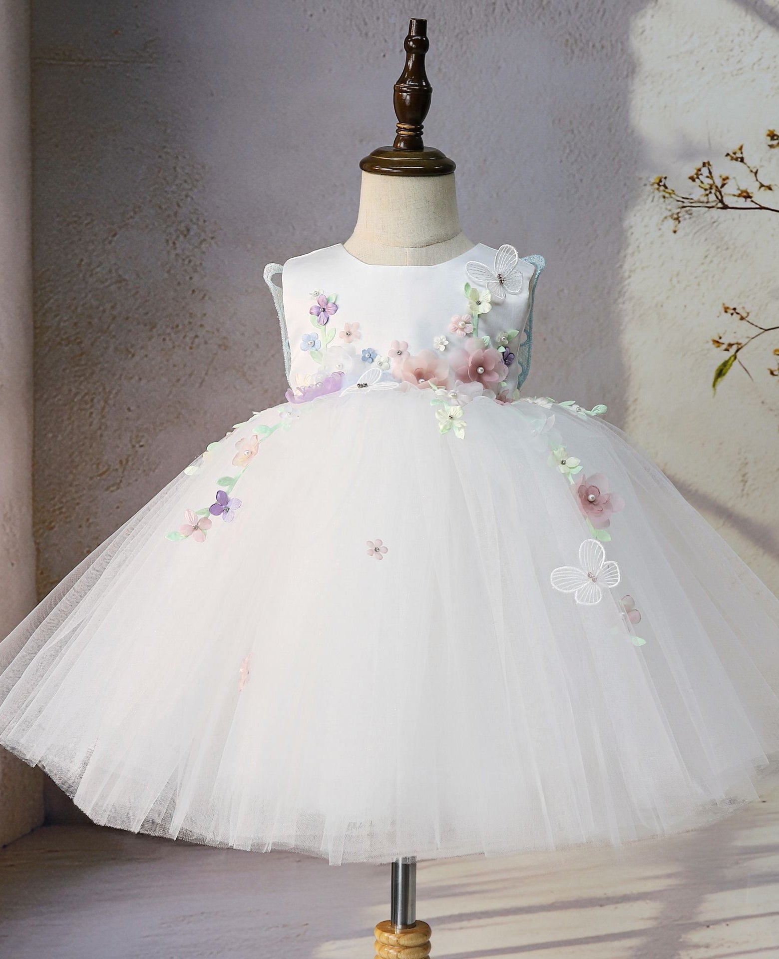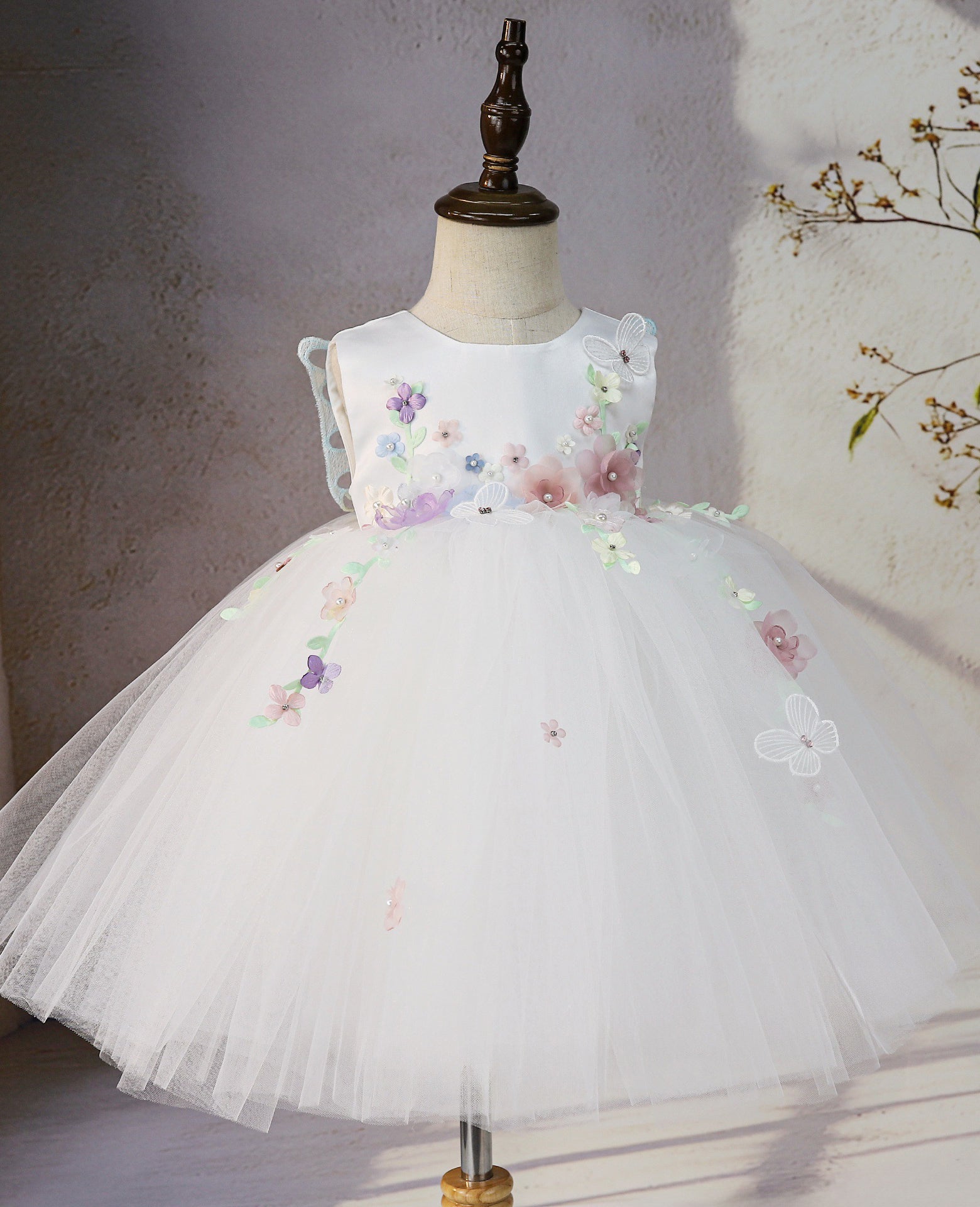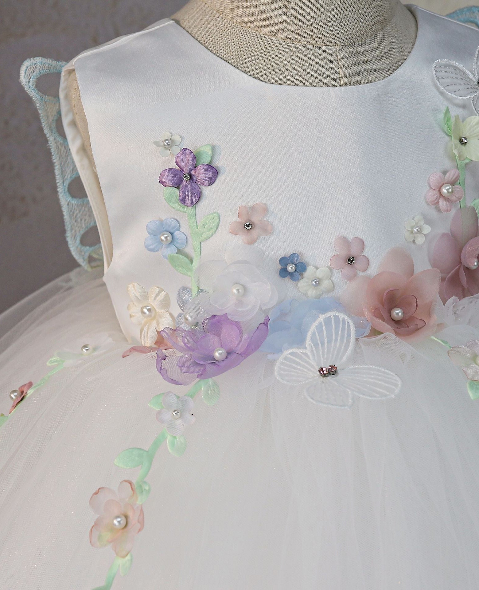 This stunning pink dress flower delicate with butterfly, a pearl collar, and a full skirt adorned with intricate floral details. A sheer bow adds an elegant touch to this timeless piece, perfect for your little girl's special day.