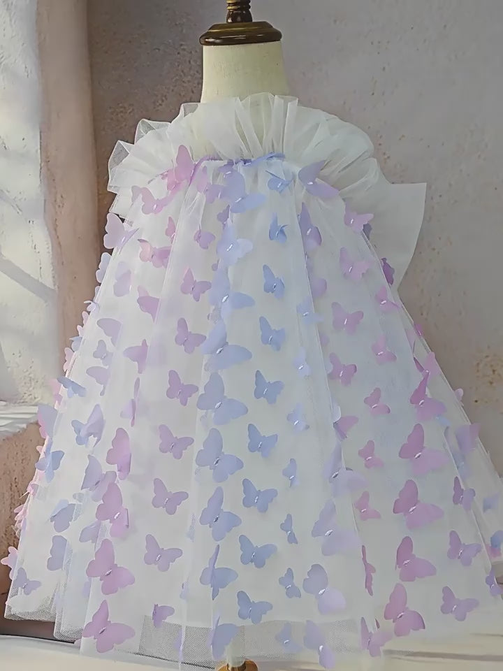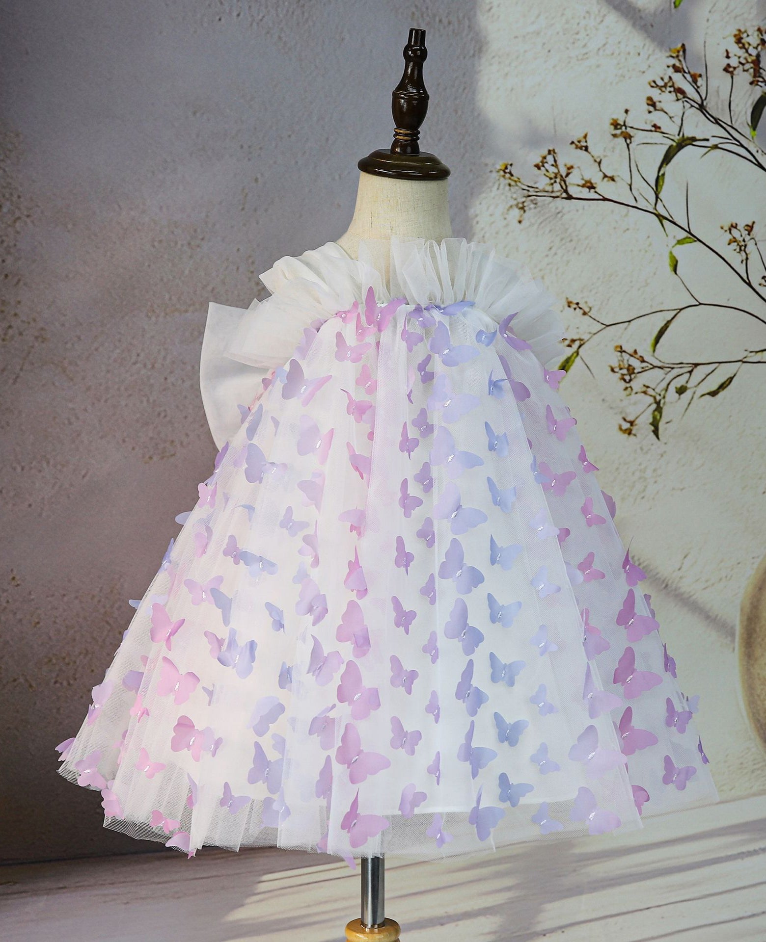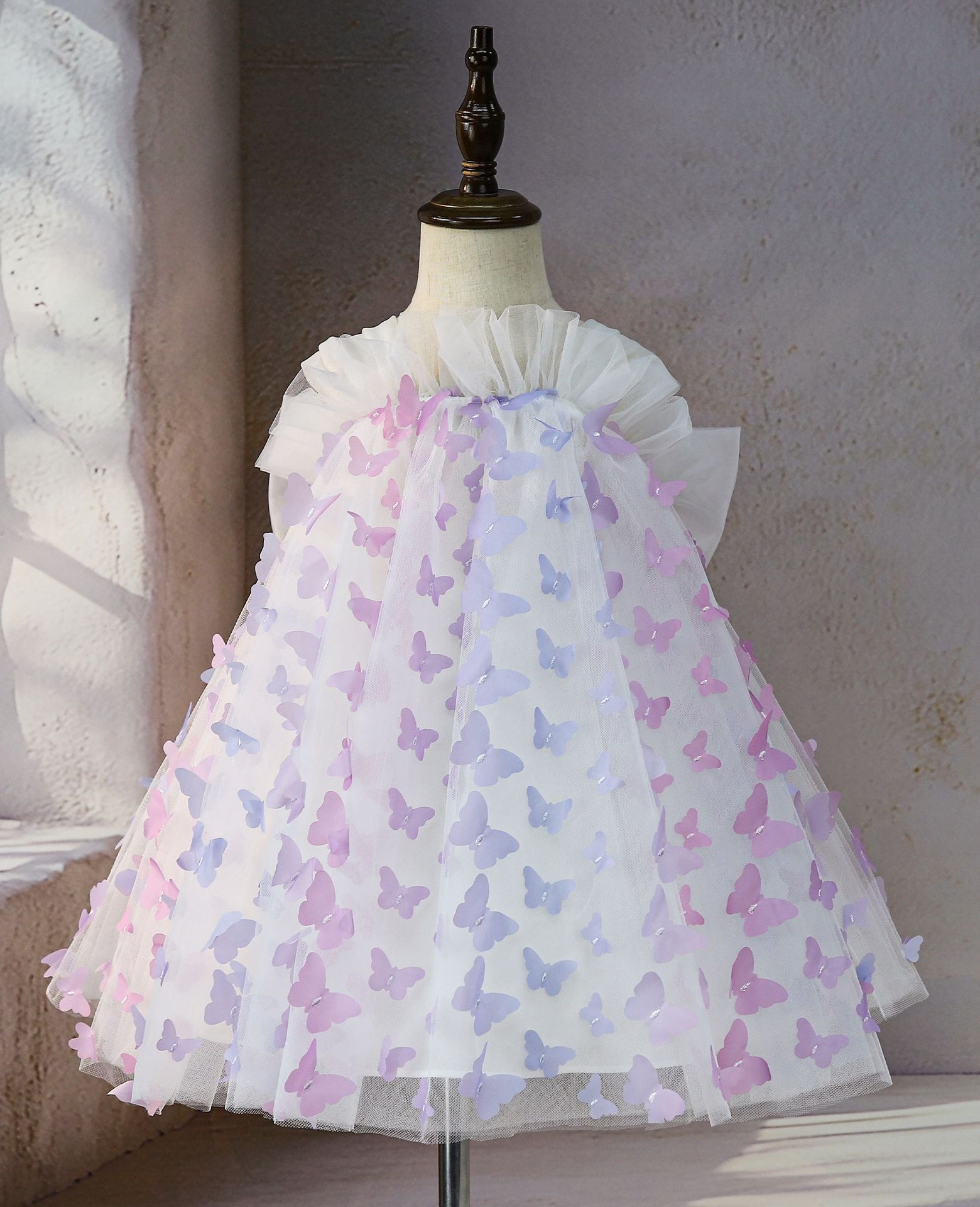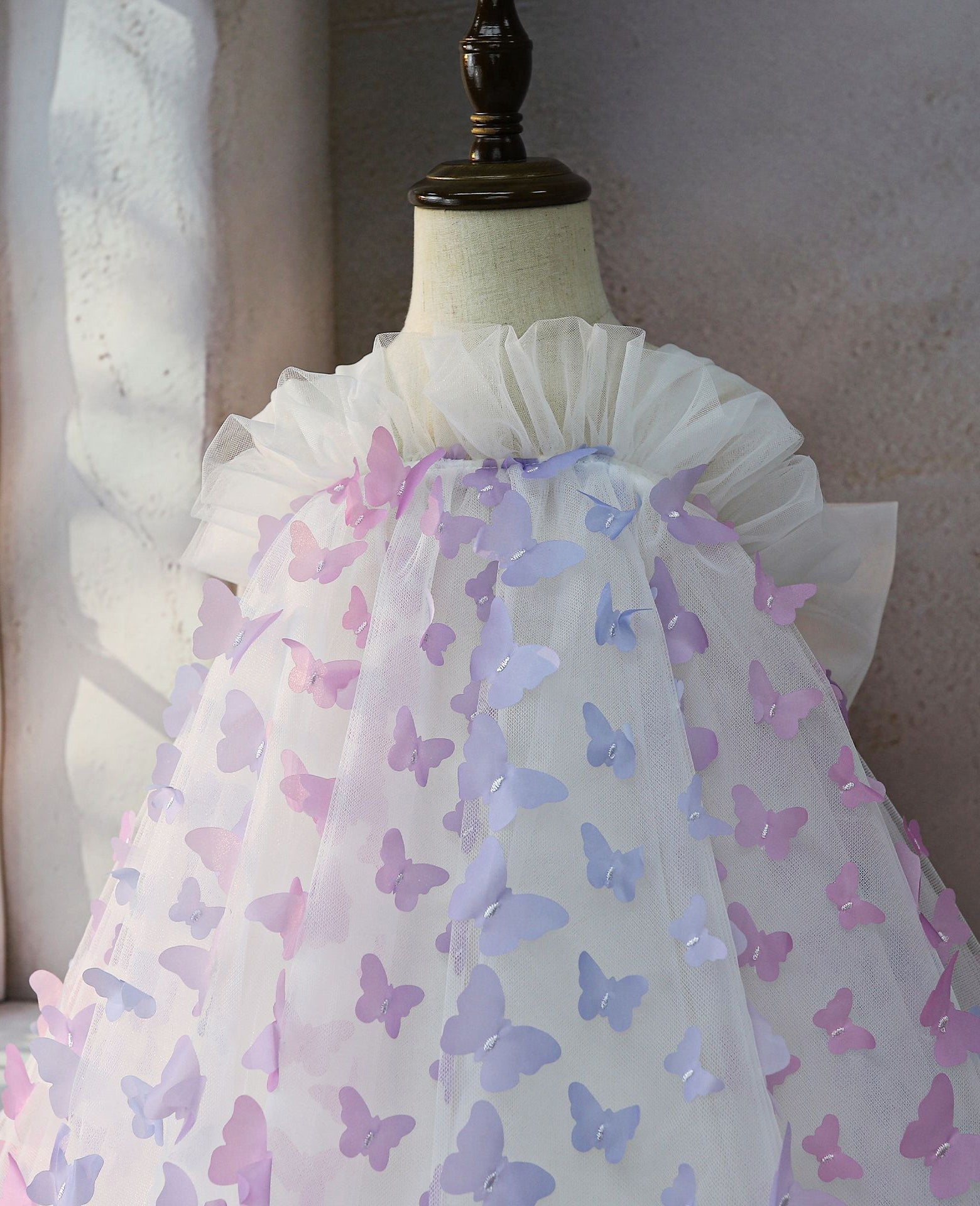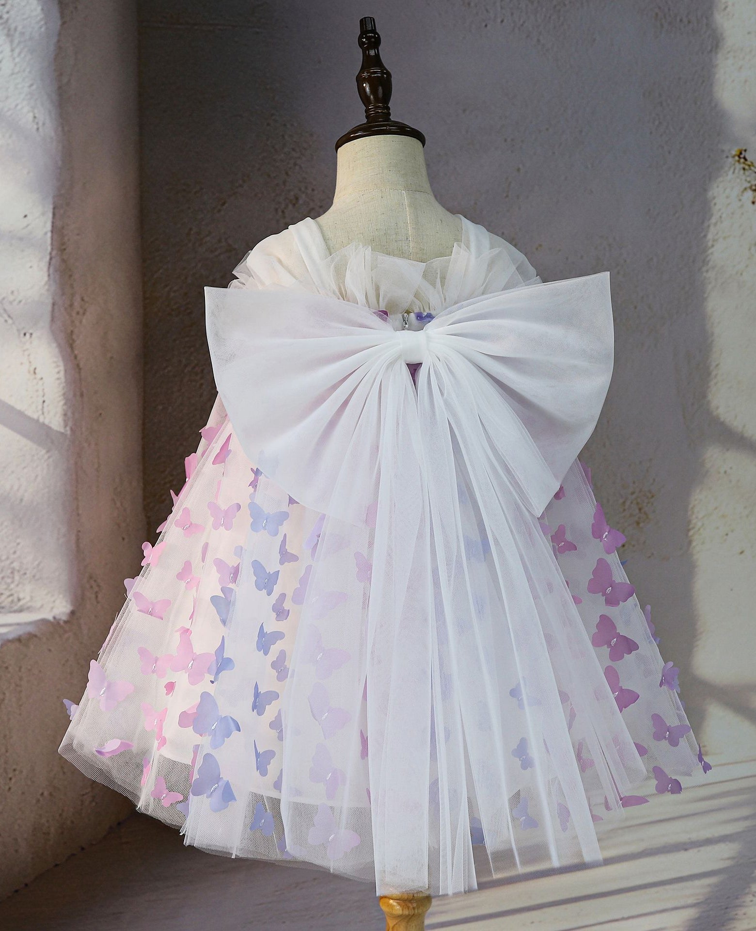 This stunning pink dress flower delicate lace sleeves, a pearl collar, and a full skirt adorned with intricate floral details. A sheer bow adds an elegant touch to this timeless piece, perfect for your little girl's special day.