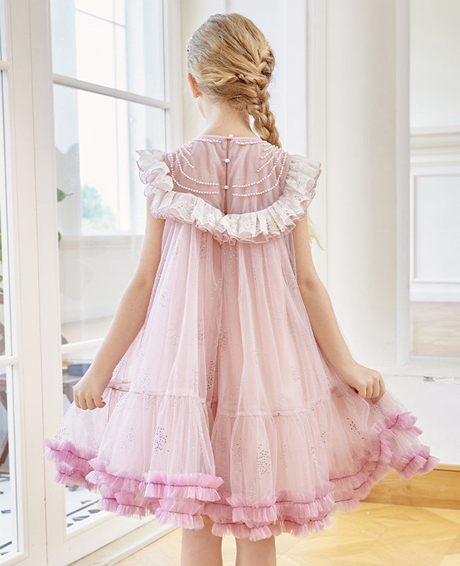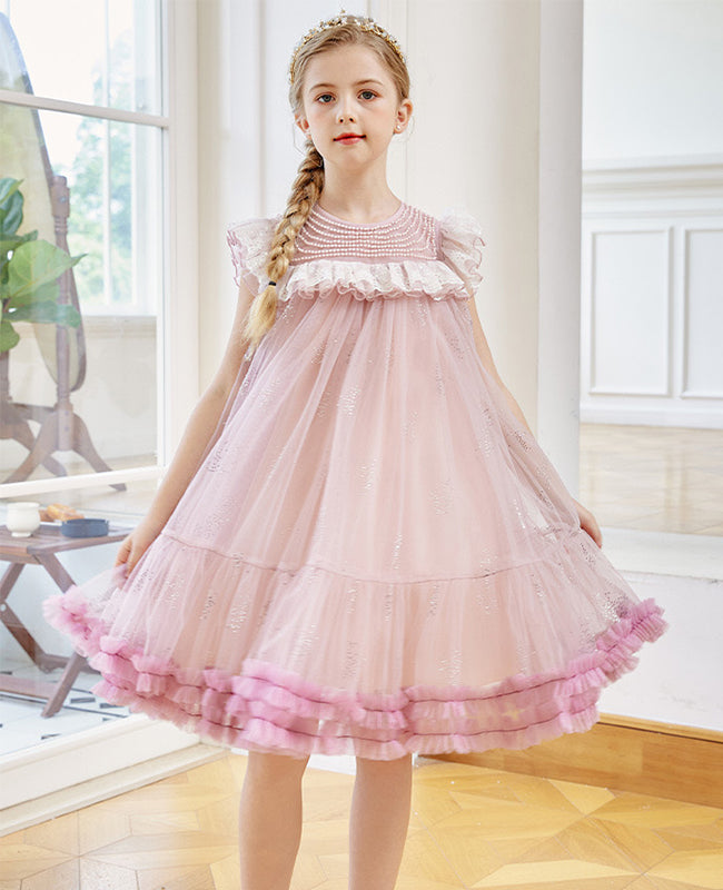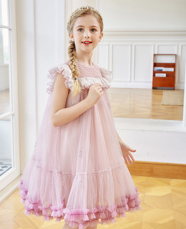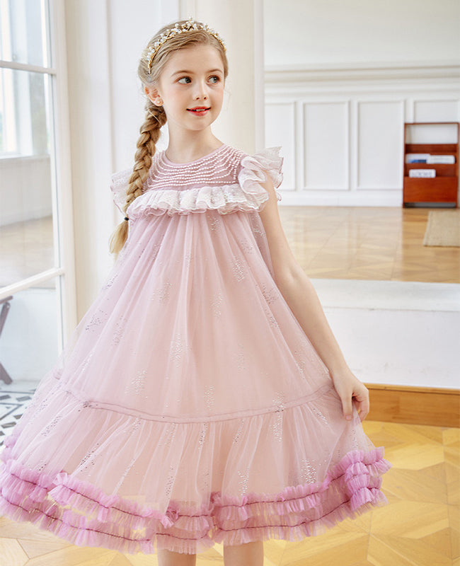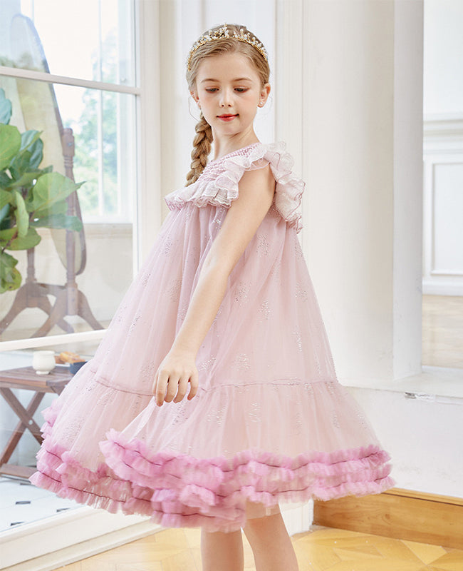 Step into elegance and charm with this adorable pink tulle dress for girls, perfect for special occasions, birthdays, weddings, or any event where she wants to shine. This sleeveless knee-length dress features a delightful blend of softness and sophistication. The dress is crafted from lightweight, flowy tulle fabric that cascades into a playful, tiered skirt, ensuring a graceful silhouette with every twirl.