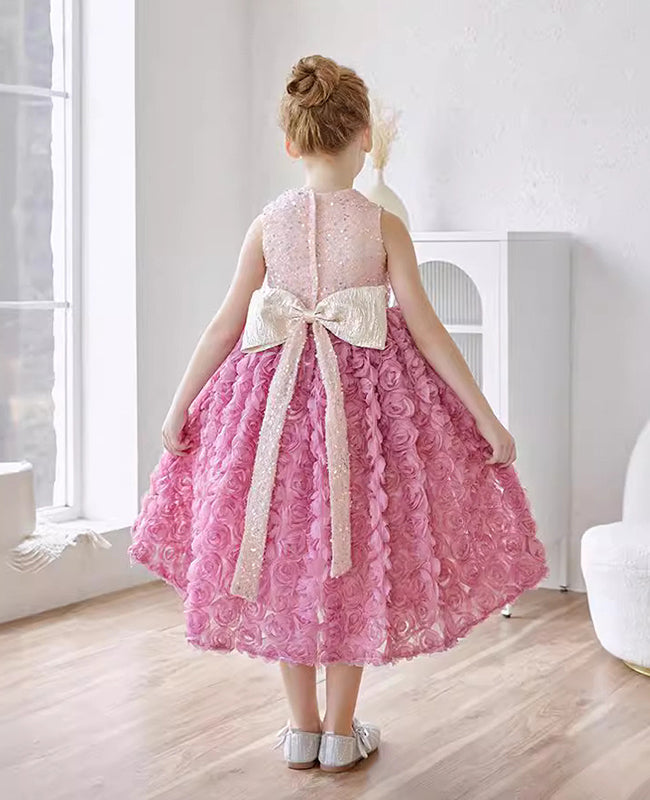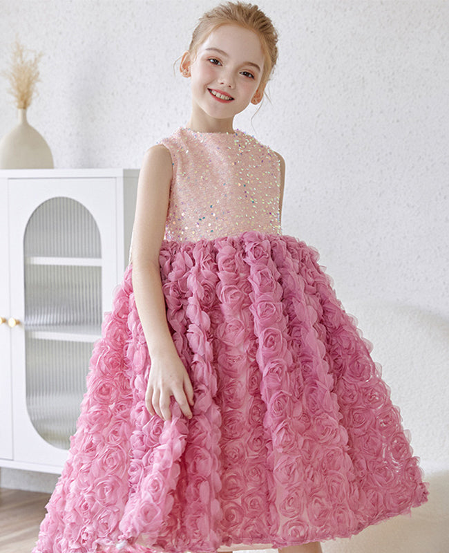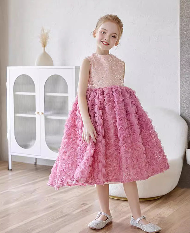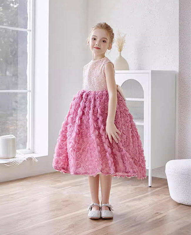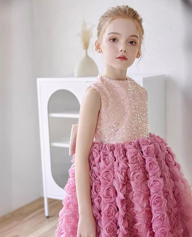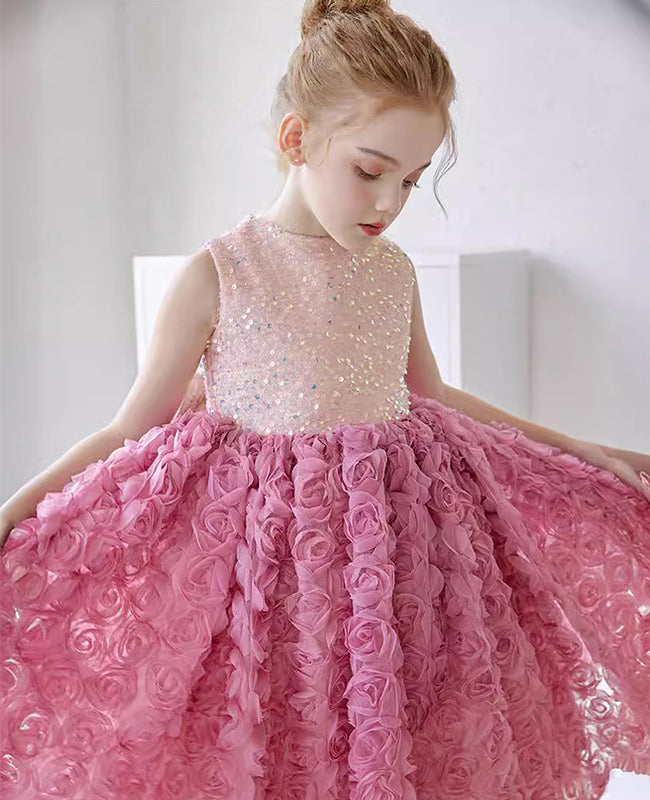 Enchant your special day with our Pink Rose Petal Flower Girl Dress. This exquisite dress features a sparkling sequined bodice that radiates elegance, paired with a voluminous skirt adorned with delicate rose petals. The sleeveless design and high neckline offer a sophisticated silhouette, making it perfect for weddings, proms, or any formal event. The vibrant pink hue adds a touch of romance and whimsy, ensuring your little girl shines brightly. A must-have for any occasion where she needs to look and feel her best.
