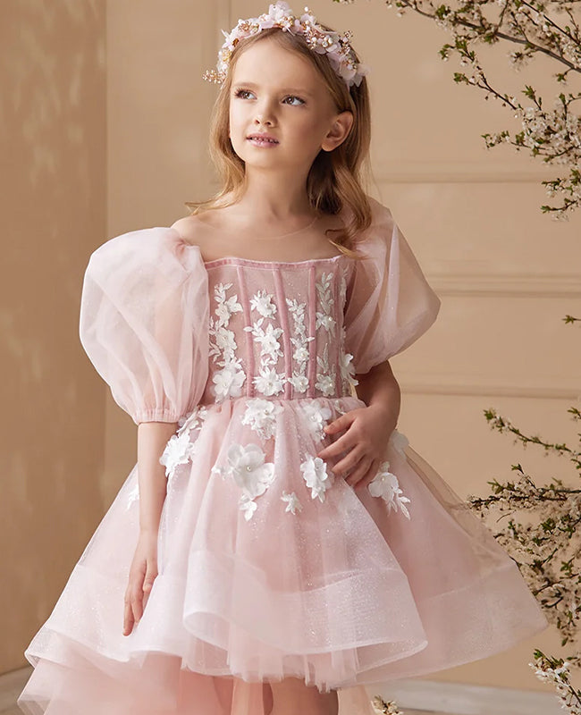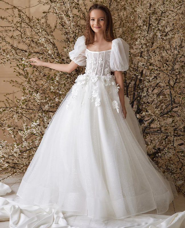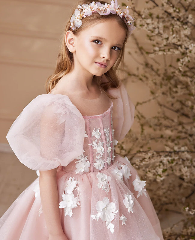 This sophisticated dress showcases a corset-style bodice adorned with floral appliqués, puff sleeves, and a full tulle skirt. It is offered in both pink and white, making it ideal for weddings, flower girls, or other special events.