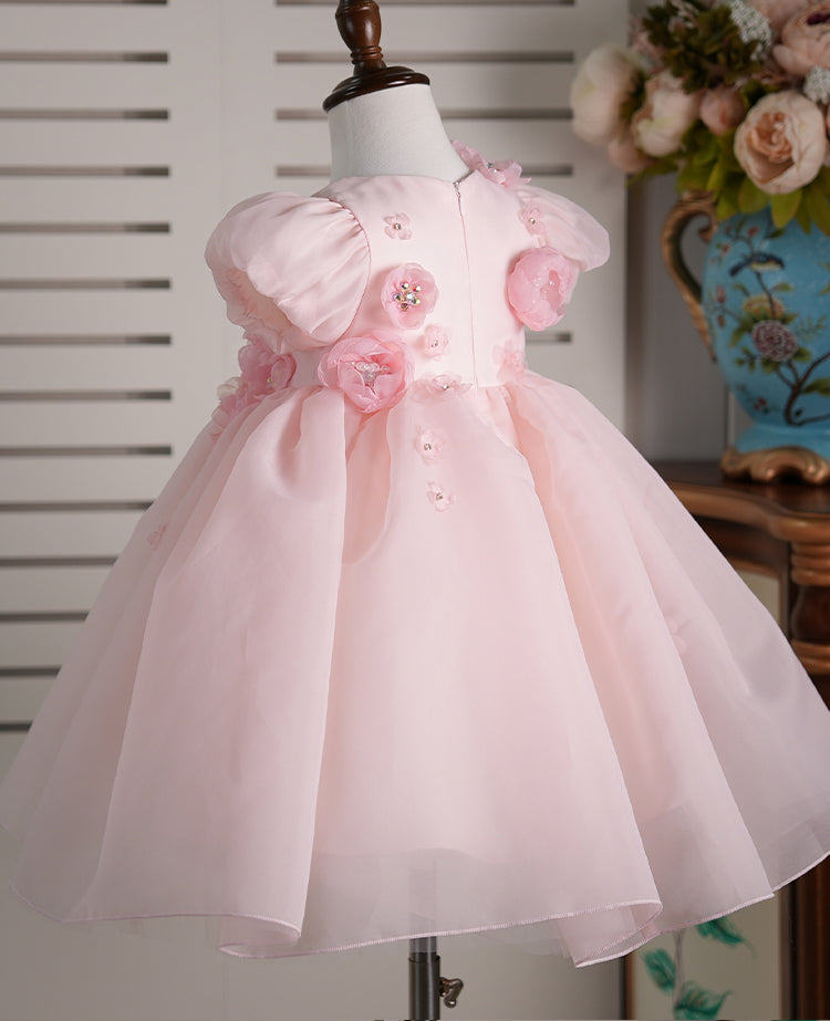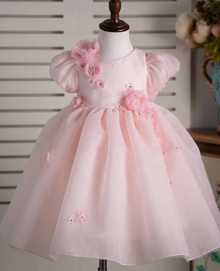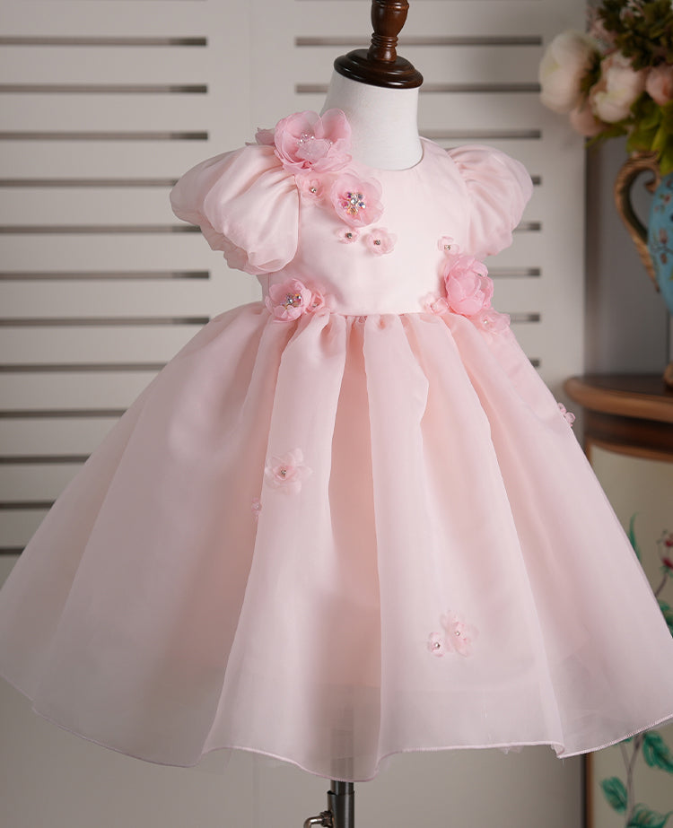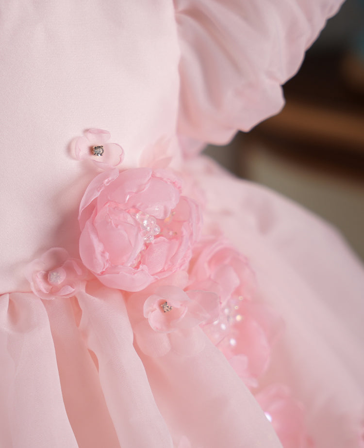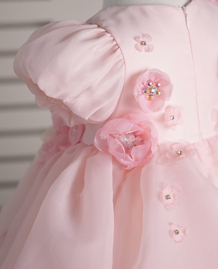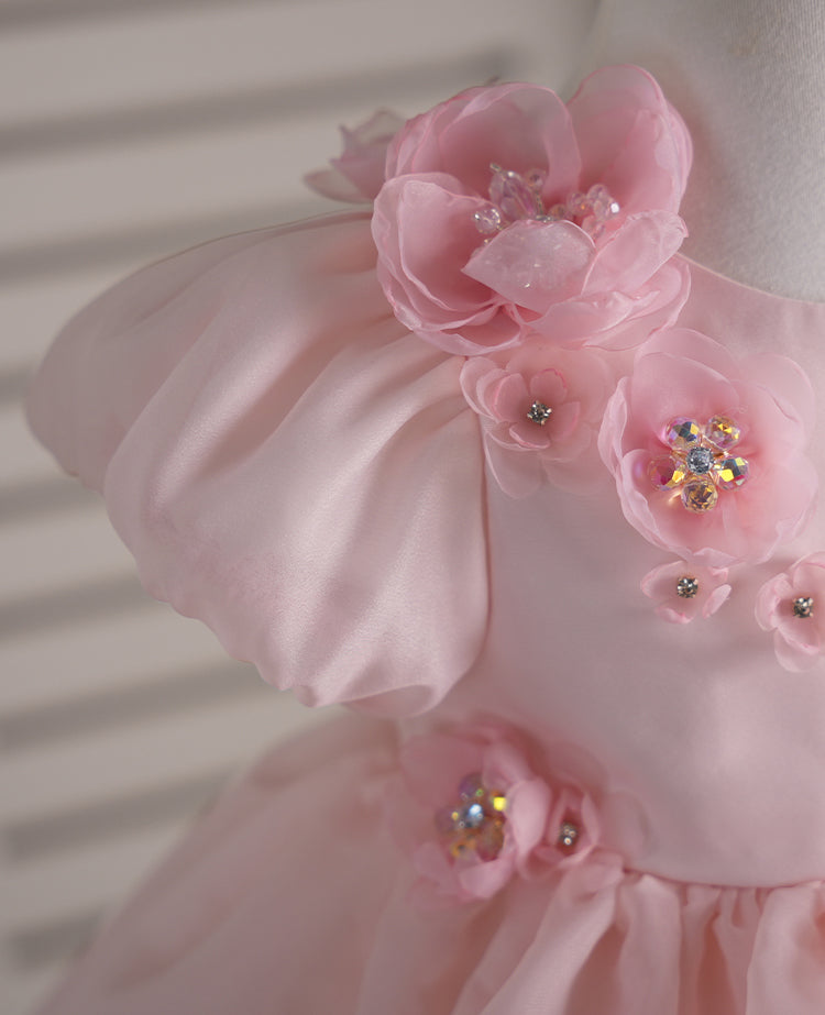 Adorable pink dress for girls with floral appliques and a tulle skirt. Perfect for parties and special occasions, this dress features short sleeves and a gathered waist for a cute look.