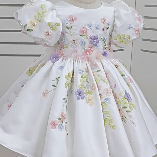 ✨ Exquisite luxury princess dress for girls, featuring delicate hand-applied floral appliqués in soft pastel hues (pink, blue, purple, green). Crafted from premium satin fabric for a comfortable, elegant fit