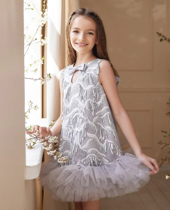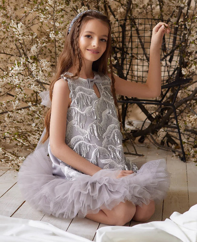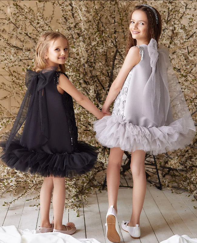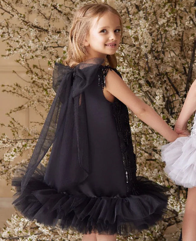 This stunning tulle dress exudes elegance and sophistication. Adorned with a shimmering sequined bodice, the full tulle skirt flows gracefully, while a delicate bow detail on the back adds a touch of charm. Get ready for your little one to make a grand entrance at any party, recital, or special occasion.
