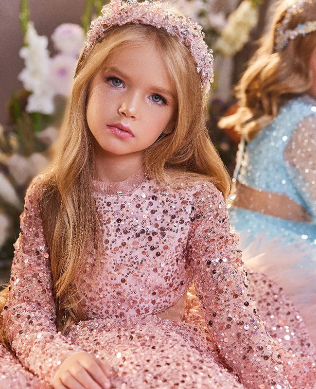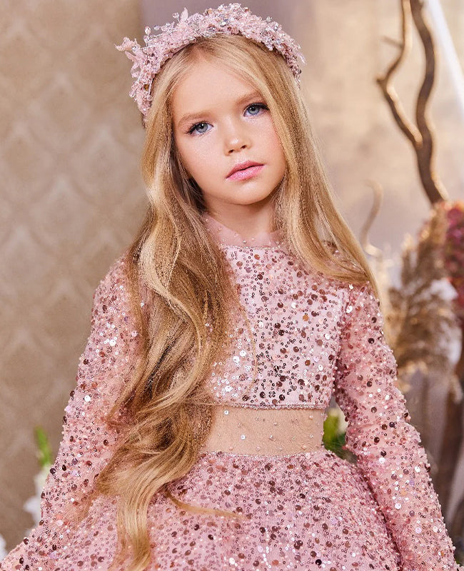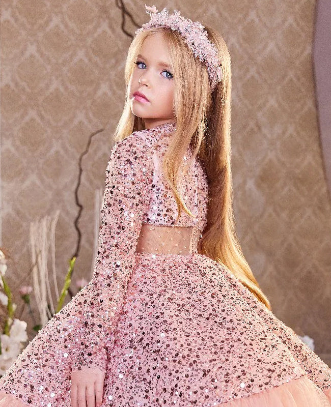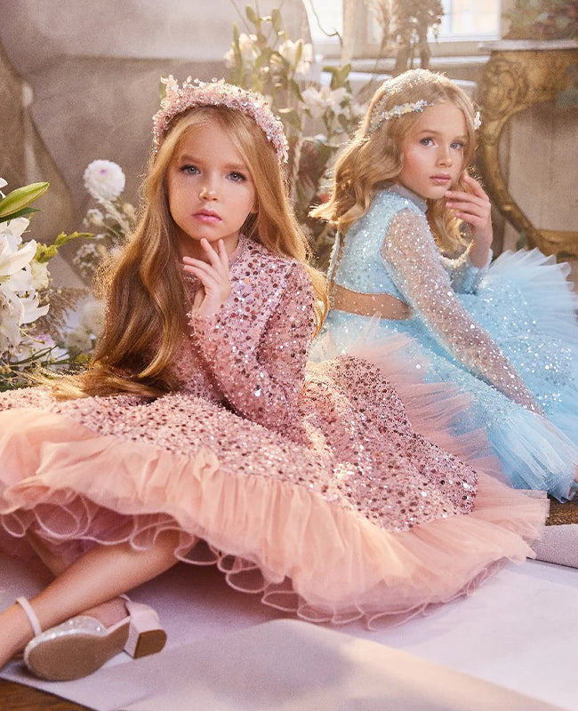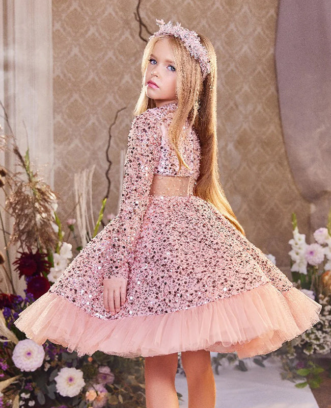 This dress features a sparkling sequined bodice and a fluffy tulle skirt. With long sleeves and a high-low hem, it's perfect for parties and special occasions.