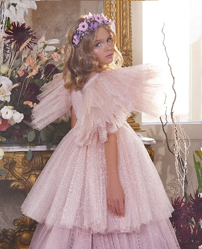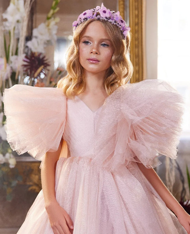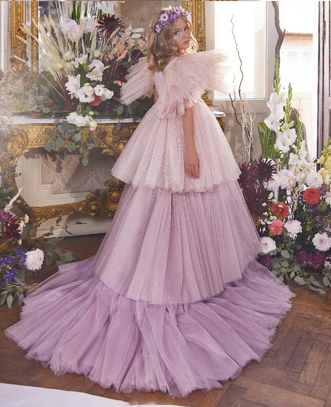 Gradient color dress with floral appliqués and sequins. Layered tulle skirt for a fairy-tale look. Ideal for weddings and special events.