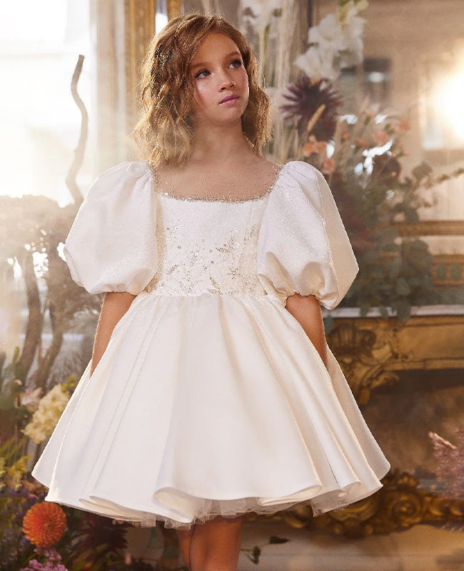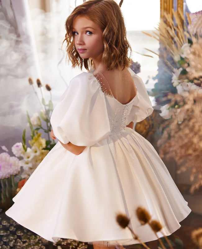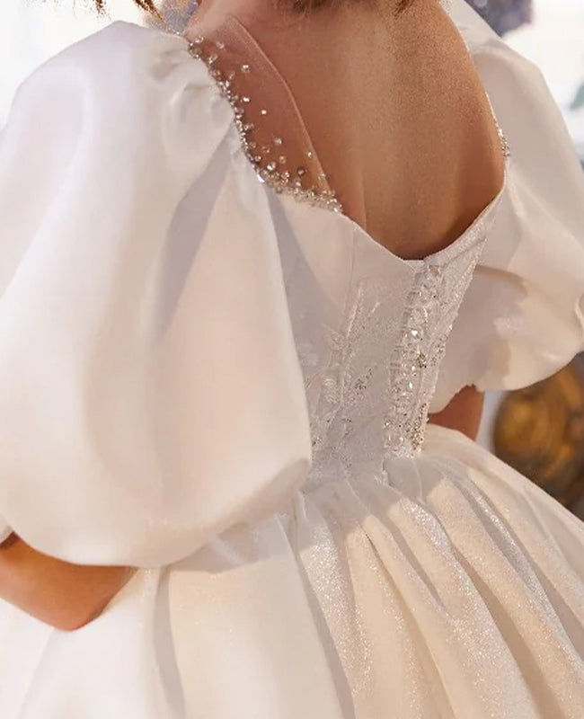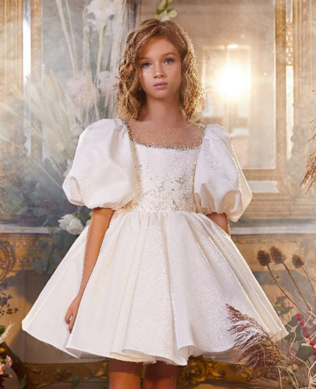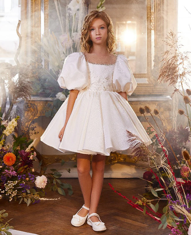Elegant and durable white dress perfect for parties and special occasions. Features floral design, pearl embellishments, breathable fabric, square neckline, puff sleeves, and full skirt for a charming and comfortable look. Made with premium materials.