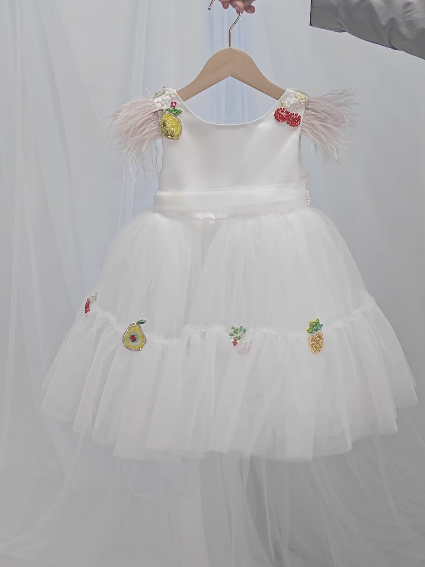 White girls tulle dress with colorful fruit appliques. Perfect for birthdays parties and themed celebrations. Features a full layered skirt with pear strawberry and apple decorations. The dress includes a round neckline and short sleeves with feather accents creating a playful fairy tale appearance.