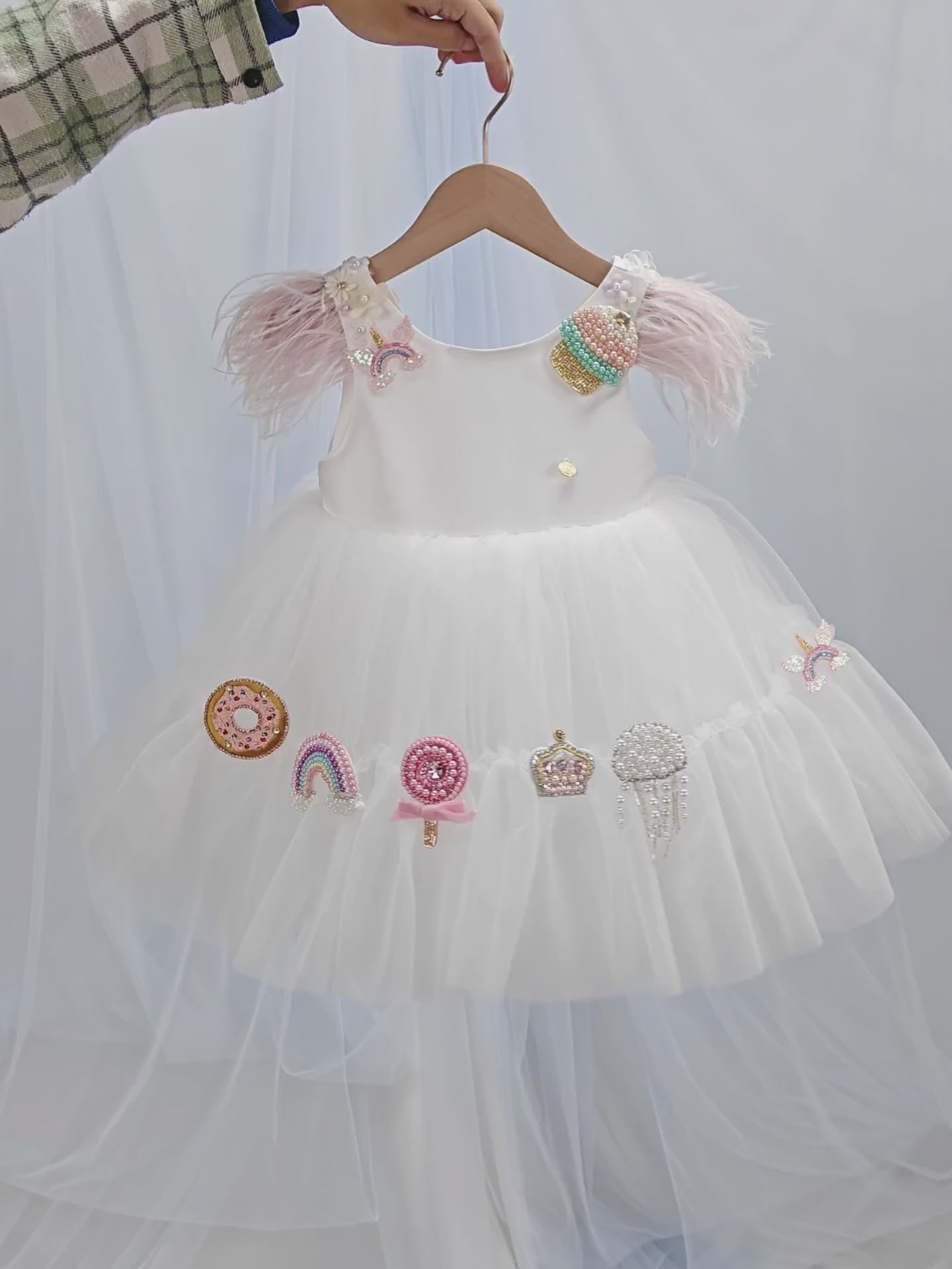 Baby girl dress with unicorn and rainbow decorations, perfect for special occasions like birthday parties and weddings. Made with soft tulle material for comfort and durability. Features feather accents on shoulders, colorful sequined appliques, and a full skirt for a whimsical look. Dress your little princess in this magical outfit that combines fantasy elements with elegant design. Great for photo shoots, celebrations, and as a cherished gift for baby girls.